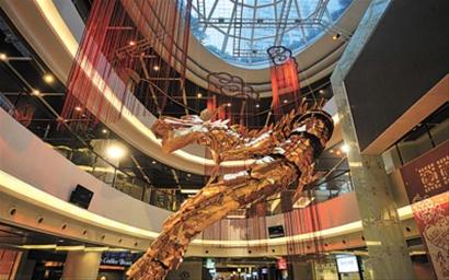 步入新天地时尚中庭,游客便可以看到一条金色的巨龙从镜面水潭底座 “跃然而出”,威武腾空,气势非凡。