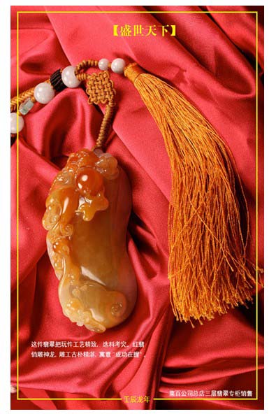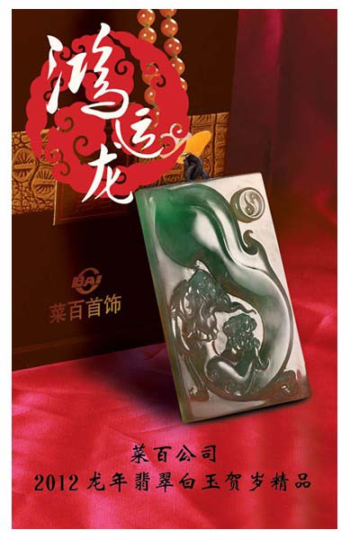 针对龙年市场,菜百公司联手玉雕大师,隆重推出龙凤对牌、龙牌、摆件系列,精选上等翡翠、和田玉精雕细刻而成,以“龙凤呈祥”、“福满乾坤”、“辰龙祥瑞”、“盛世天下”、“王者之风”、“溢彩龙王”为创作题材,精雕出风格各异的龙飞凤舞和合场景,将中国文化气息浓郁并富有诗意的玉雕精品,倾力于广大消费者,将平安兆吉庆,好事皆成双的祝福带给大众。