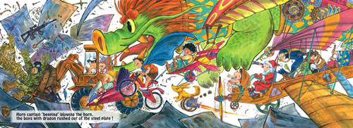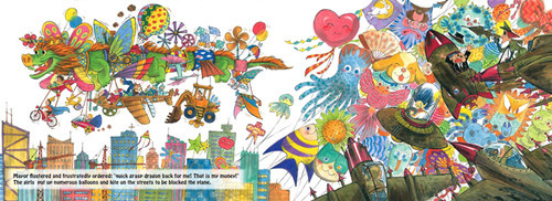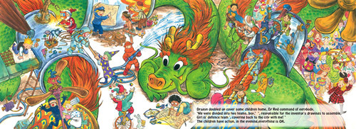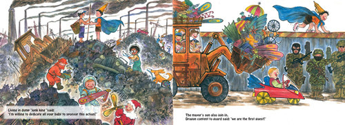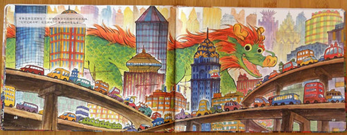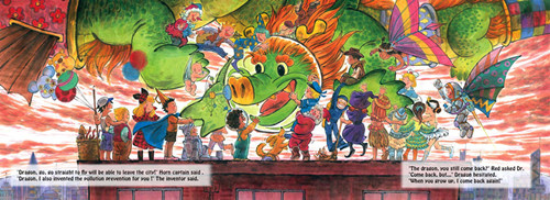 就在这时,三个孩子遇见了龙,他们三个虽然在书里没有姓名,但是从服装到神态分明是小飞侠、臭美妞和科学迷,这三个小朋友召唤来了全城的孩子,一场搞笑的救龙大战开始了。