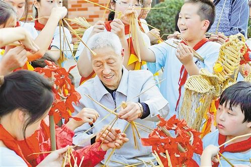 十月二十四日,北碚区状元小学。草把龙传承人刘映升正在向同学们传授草把龙制作技艺。记者 万难 摄
