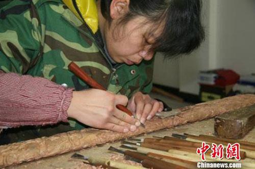 雕刻艺人正为香港客户订制的桃木剑赶工。张继航 摄