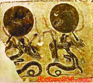 汉代画像石上的伏羲女娲蛇身像。相传华夏民族的始祖伏羲和女娲形象中的“蛇身”,是龙的原始形态。