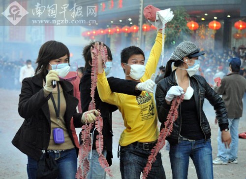 2月5日,久负盛名的宾阳“炮龙盛宴”又一次开场。伴随震耳欲聋的鞭炮声,105条炮龙在大街小巷的滚滚硝烟中游走,所到之处一片欢腾。20多万游客现场体验了被“炸”的感觉,当地人认为“炮龙盛宴”鞭炮越多日子越红火,而外地游客则尽情地享受着炸龙戏龙的乐趣。本报记者农如松摄