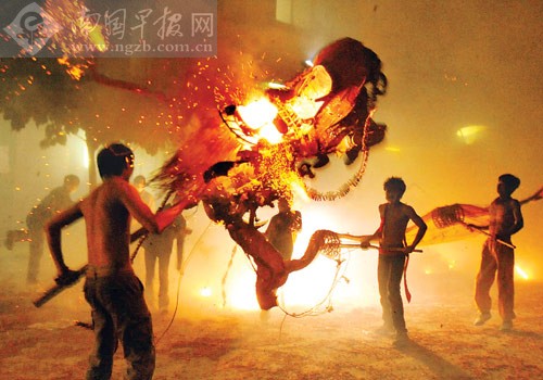 潜伏已久的一百多条巨龙早已急不可耐,待到龙王的“开光”仪式一结束,立即在街道上上下飞舞,来回盘旋。顿时全城鞭炮雷鸣,鼓声震天。