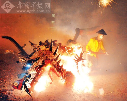 宾阳县一位制作巨龙的艺人邹玉特说,当地人相信,用鞭炮去炸龙能带来一年的兴旺;而舞龙者则认为,龙身被炸得越烂,越是能给人们带来吉祥如意。