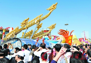 代表广东的“领潮争先”彩车,在位于广场的西侧,五条金龙昂首奔腾,在彩车中十分显眼。虽然表演人员不在,但30尊金色塑像放在车上,与游行时的状态差别不大。金色塑像个个身材健硕,栩栩如生,与龙舟相得益彰,更突显广东省人民奋勇拼搏的精神面貌。记者观察到,不少中外游客均被广东彩车所吸引,纷纷拍照留影。记者随机采访了一对来自美国的老夫妇——杰森先生与太太,他们告诉记者,“我们觉得这辆彩车十分具有中国特色,因为有金色的龙舟,还有巨大的中国鼓。这些元素在我们看来是很有东方味道的,我们很喜欢。”