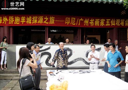由中国文化艺术研究中心、印尼龙文化协会、广州市越秀区旅游局、广州市越秀区博物馆联合主办的“海外侨胞羊城探源之旅——印尼/广州书画家五仙观笔会”, 于7月19日上午在具有632年历史的广州祖庙五仙观举行。中国文化艺术研究中心执行主席陈志雄、副主席黎艺豪、副主席苏宝源以及广东地区书画家董炽强、秦建中、黄耀联等20多人参加了活动。远道从 “千岛之国” 来到广州开展学术访问的印尼龙文化协会主席陈立辉和印尼画家金阳出席笔会并进行象形龙字书法的创作。作为越秀区博物馆的五仙观破例开放了供奉五仙神像的主殿作为笔会主会场,令这次羊城探源主题的中印文化交流活动增添了浓厚的色彩。