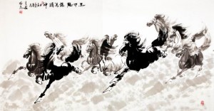过了些日子,他约我去他的画室。但见四面墙壁上,宽大的画案上,奔腾的,全是马。一匹跨涧的,称《跃龙在渊》;两匹并肩的,称《同行天下》;六匹参差的,称《六龙腾骧》;九匹成阵的,称《九子竞骋》……这些马,都是活泼的、灵动的、扬首奋蹄的、乘风携云的、精神抖擞的、一往无前的;面对它们,我似乎听到了咴咴的嘶鸣声和嗒嗒的蹄响声,似乎看到长路上荡起的一团团烟尘,看到了原野上滚潮般向前涌奔的阵列。于是说:“你这些马,真的都成龙了。”郝先生谦然一笑,说:“你是龙文化研究专家,多提意见啊!”