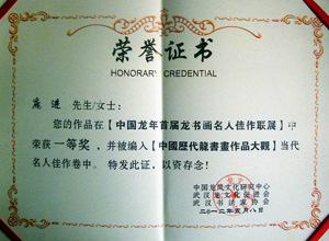 另讯:庞进的书法作品《龙马》在“中国龙年首届龙书画名人佳作联展”中荣获一等奖,并被编入《中国历代龙书画作品大观·当代名人佳作卷》中。图为获奖证书。