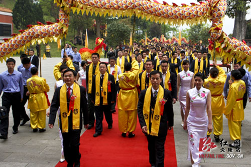 9时09分,仪式主持人炎陵县人大常委会主任古友发宣布:壬辰清明炎陵县社会各界祭祀炎帝陵典礼仪式开始!击鼓九通,鸣金九响,鸣炮奏乐……刹时,大家的思绪都凝聚到庄重、肃穆的祭祀仪式上。