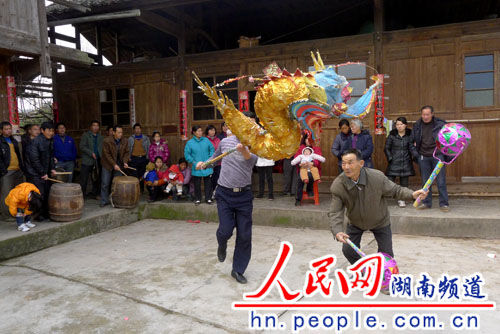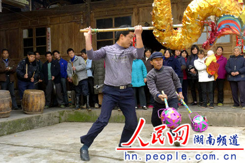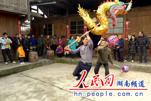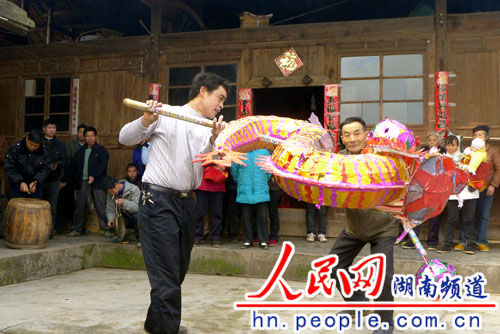 人民网芷江2月17日电(通讯员 龚卫国) 湖南省芷江侗族自治县土桥乡富家团村,是国家级非物质文化遗产——“孽龙舞”的流传地。今天上午,“孽龙舞”传人田宗林、田志可、田子才、田希红4个人在村民田晓明家舞起“孽龙舞”来,他们用这种独特的方式闹元宵。据悉,“孽龙舞”在2010年被列入了全国第三批非物质文化遗产。