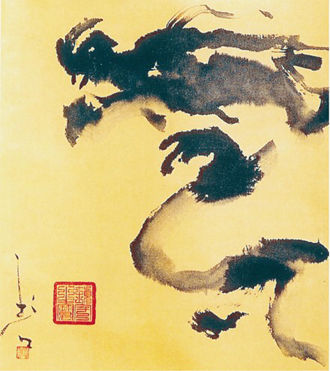 龙:我在画龙的技法上进行了一些革新。古代人画的是墨龙,很深敛,没有彩龙。有的把龙画的很恐怖,眼睛大大鼓鼓的,这样的龙只能挂在寺庙里。要让龙飞进千家万户,家家都挂上龙,必须要从三个方面进行调整。第一个是结构:嘴要缩短,显得善良;额要加宽,显得智慧等。第二个是颜色:彩龙可以拉近与人的距离,产生美感,挂在家里营造出和谐氛围。第三个是理念:需要被重新认可。其一,龙是国家形象,长城是龙、黄河是龙、天安门的华表上也是龙;其二,龙是民间图腾,他是和谐好运、吉祥辟邪、风调雨顺的象征。如孩子考上大学是鲤鱼跳龙门、望子成龙,夫妻结婚是龙凤呈祥,还有龙腾虎跃、龙马精神等等,这说明龙在民间具有很广泛的群众基础。因此,弘扬中华龙的文化就是振奋民族龙的精神!