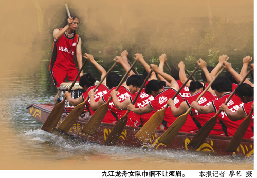 今年4月,广州亚运会中国龙舟选拔赛在顺德大良华桂湖举行,来自全国各地的12支男女子龙舟队参赛,九江男女子龙舟队均列总成绩前茅,一举战胜了由众多从全国各地征调的专业运动员组成的肇庆队。