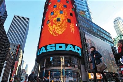 1月20日,在美国纽约,几名游客走过播放有中国龙形象的纽约曼哈顿时报广场纳斯达克电子屏幕。当日,美国最为繁华的纽约时报广场纳斯达克电子屏幕上,循环闪现中国龙形象,庆祝即将到来的中国龙年春节。均新华社发