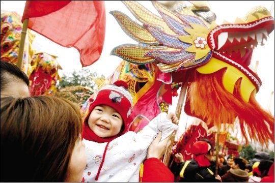 昨日,一位近两岁的小朋友看到舞龙开心的笑。本报记者 原丽阳 摄
