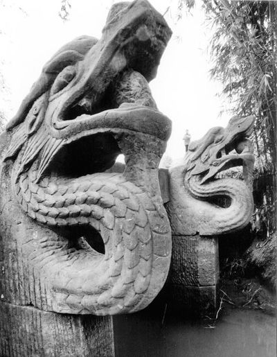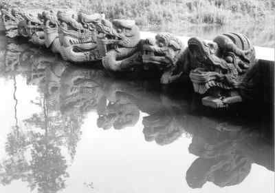 记者仔细观察,龙脑桥上的每一个龙兽雕刻都各具特点:狮子张口含笑,脚踏绣球;大象长鼻弯曲,饮水河中;麒麟口含绶带,上下大牙相咬,凶猛威武。4条龙的形象尤为突出:它们高出群兽之上,脚踏祥云欲飞欲动,龙身的鳞甲、嘴下的胡须以及眼、口、角、耳等雕刻得十分精致而有力。中间最大的一个龙头顶部刻有一个“王”字,似乎是群龙之首,头重约8吨。尤为称绝的是,“龙王”口中含了一颗重达50千克的石球“宝珠”,可滚动而不可出。“在洪水来临时,水流冲激石球,滚动之声,隐约可闻。”陈凤贵说。