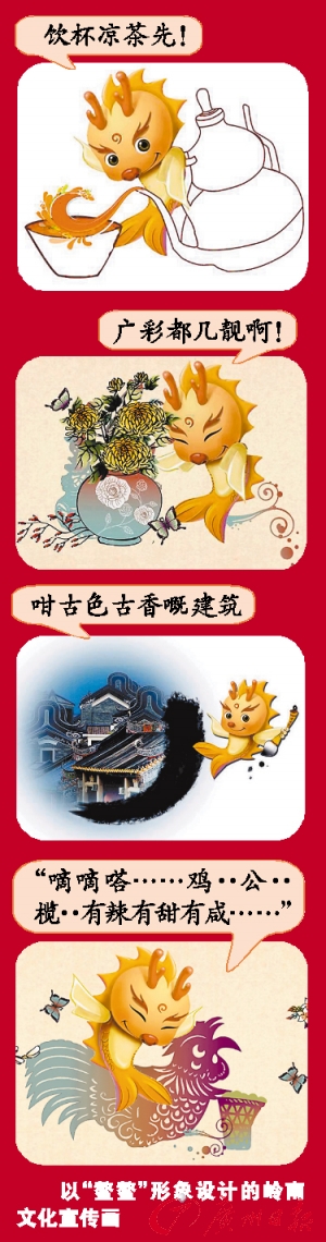 据介绍,鳌鳌不仅成为九艺节的吉祥物,还将担任岭南文化的代言人。应“九艺节”筹委会要求,他们设计出多款展板,将“鳌鳌”与广彩、广绣、南狮、鸡公榄等结合,用鳌鳌展示广州城市形象。“小鳌鳌卖鸡公榄”、“小鳌鳌教你说粤语”等不久将在机场及商业街展出。