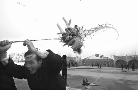 最引人注目的是两只“巨龙”风筝,它们的制作者是来自山东潍坊的风筝大师张全军。“这两条‘龙’是我为了参加风筝节特制的,龙身有70多节,竹子做骨架,龙身彩绘是潍坊著名的木版年画,整整用了3个月才做成。”张全军说。
