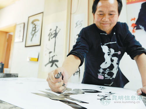 今年4月27日,国家文化部原常务副部长、现任中华文化促进会主席高占祥到昆明,当他偶然看到昆明奇人向忠俊用拳头砸的“虎”时,感到这种稀奇的书法有继承有创新,于是挥毫“中国一拳”相赠。从此“中国一拳”在书法江湖打出了一片天。毕竟,笔是书法之寻常道,而拳是书法之非常道,向忠俊能用拳头写出一手漂亮字,这在技艺上叫出奇制胜,在书法艺术上能彪炳史册。