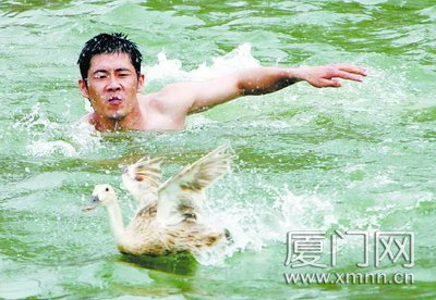 昨日上午9时,当记者来到南薰楼前游泳池抓鸭现场,只见游泳池四周已经围满了观众。据抓鸭组组委会负责人王铮铮介绍,抓鸭比赛本来安排在9时开始,由于参赛人员来得较早,就提前到8时30分了。
