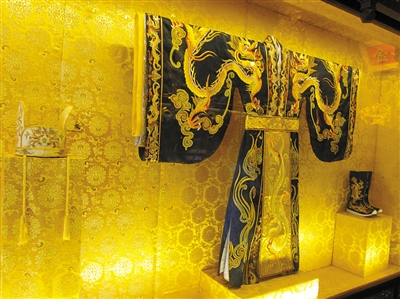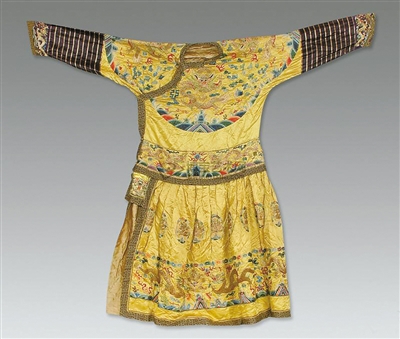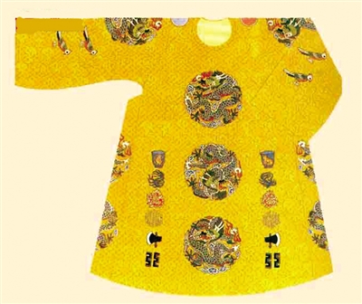 清代龙袍以明黄色为主,也可用金黄、杏黄等色。清朝皇帝的龙袍,据文献记载,绣有九条龙。龙袍的下摆,斜向排列着许多弯曲的线条,名谓水脚。水脚之上,还有许多波浪翻滚的水浪,水浪之上,又立有山石宝物,俗称“海水江涯”,它除了表示绵延不断的吉祥含意之外,还有“一统山河”和“万世升平”的寓意。