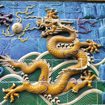壁上部为黄琉璃瓦庑殿式顶,檐下为仿木结构的椽、檩、斗栱。壁面以云水为底纹,分饰蓝、绿两色,烘托出水天相连的磅礴气势。下部为汉白玉石须弥座,端庄凝重。壁上9龙以高浮雕手法制成,最高部位高出壁面20cm,形成很强的立体感。纵贯壁心的山崖奇石将9条蟠龙分隔于5个空间。黄色正龙居中,前爪作环抱状,后爪分撅海水,龙身环曲,将火焰宝珠托于头下,瞠目张颔,威风凛然。