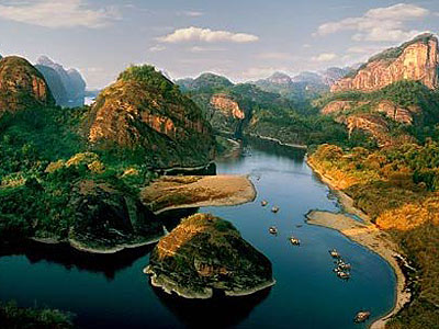 龙虎山龙虎山位于江西省鹰潭市西南20公里处贵溪市境内,是道教正一派的祖庭。东汉中叶,正一道创始人张陵曾在此炼丹,传说“丹成而龙虎现,山因得名”。据道教典籍记载,张陵第四代孙张盛在三国或西晋时已赴龙虎山定居,此后张天师后裔世居龙虎山,至今承袭六十三代,历经一千九百多年。北京时间2010年8月2日,龙虎山与龟峰被一并列入《世界自然遗产名录》。