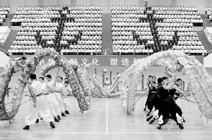 海军工程大学训练场上人声鼎沸,只见一条“长龙”忽左忽右,忽高忽低;一头“雄狮”则演绎着扑跌、蹿高、朝拜等技巧,动作刚健,英气逼人……