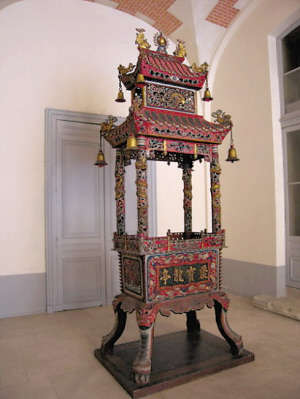 法文注释如下:香炉,用于焚烧香火,铸造彩绘年代:1857 年。来源:中国汉阳龙王庙。1864年由欧仁妮皇后陈列于此处走廊。
