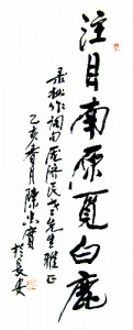 三个姑母之外,父亲和他的奶妈韩氏感情也很深。韩氏是蓝田白鹿原白村人,父亲出生后不久就来到了庞家。她身高体壮,慈善和蔼,奶养父亲到三岁多才离开。韩氏家贫,生一男孩,时年三岁;生一女,养不起,送了人。她是带着男孩来的,父亲便叫那男孩为奶哥。庞家每月付她三块银元。1975年,父亲的这位奶哥因生活困难来找他的奶弟,父亲招待他吃了饭,给了些钱,并给他买了二百五十斤玉米。20世纪90年代初,一个晚上,我到作家陈忠实的办公室里去,见他桌上有笔墨,就请他给父亲写一幅字。老陈铺纸,膏墨,提笔,略加思忖,就写下了“注目南原觅白鹿”几个字。我拿回家给父亲看,父亲很高兴,扳着指头说:“陈忠实写白鹿原,其实,咱家和白鹿原也有关系哩。我的大姑、小姑、舅家、姐家、外甥家,还有奶妈韩氏家,都在白鹿原。”