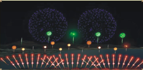 烟花设计:“龙”字特效礼花、虎尾特效造型等烟花在欢快的节奏中飞舞、绽放。