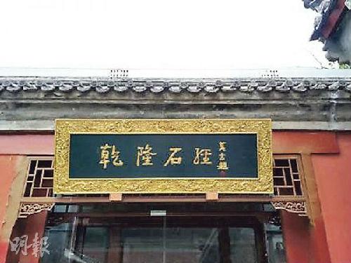 北京孔庙国子监博物馆一幅匾额上自左向右题写了“乾隆石经”,落款为莫言。(图片来源:香港《明报》)