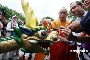 2009年7月23日,美国纽约香港龙舟节主办方在纽约中央公园举行“点睛醒龙”仪式,宣布第十九届香港龙舟节将于8月8日开幕,来自北美各地的一百五十多支队伍将进行两天的角逐。主办方当日请来纽约云门寺的明予法师念诵经文,给船身洒净,并用毛笔蘸上红颜料在船头龙眼上“点睛醒龙”。中新社发 孙宇挺 摄