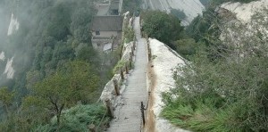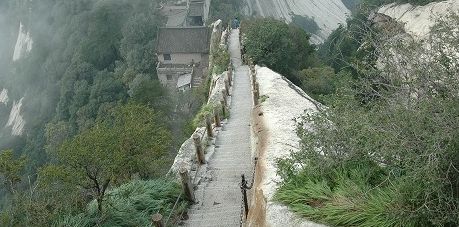 登上华山北峰,再向南折,经擦耳崖,过上天梯,便有一长岭呈现眼前。它莽莽苍苍,笔直插天,好像苍龙腾空,所以被称为“苍龙岭”。此岭上的台阶只有2尺多宽,两旁万丈深壑,势陡如刀削斧劈。岭脊上下高差约500米,坡度在45度以上。在这里遥望青松白云,耳听风声大作,令人心惊目眩。游人到此,莫不惊叹。