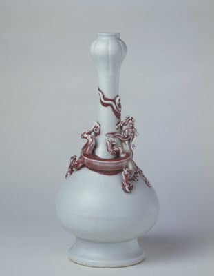 瓶口部刻细线蒜瓣纹,腹部有粘接痕一周。瓶颈至肩部塑贴一条红色螭龙,曲体上仰,口衔仙草,由肩部向颈部盘绕,卷尾与首相接,四肢平伏于瓶肩部。白釉上红螭凸起,效果神奇,颇富艺术感染力。