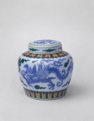 盖罐盖面微现弧度,面饰青花飞龙一条,壁绘斗彩朵云纹。器腹部饰青花三爪飞龙两条,间以绿彩朵云,肩、胫处以黄、红、绿彩分别绘覆仰莲瓣纹。飞龙形象生动,动感强烈,清逸秀雅。此时朵云的形象较之前略显粗糙,造型审美艺术感不足,呈长长的块状,二头一尾、三头一层。