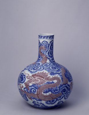 瓶外壁以青花、釉里红绘云龙出海,造型稳重端庄。图案画法使用“龙身在云中三现”的表现形式,龙身只露出三段,其它部分被浮云遮掩,故称“一身三现”,确有“云从龙”之感。此种斑片云纹,顺治时最为流行。康熙时亦常用,到乾隆时期画面更加写实。 此时的龙纹较最初已有较大的改变,龙首,上下颚胡须,头颈上的疏毛,以及龙爪龙身,均已形成清代龙纹的特色。