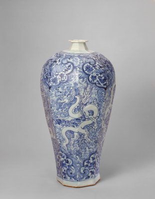 梅瓶瓶身修长,肩饰斜格锦纹,锦纹下一周大如意云头纹,内绘凤或麒麟穿牡丹图样,瓶身中部一周绘4条白龙,衬以青花海水和火焰纹,近足处饰一周如意云头纹,内绘牡丹花叶。造型硕大丰满,纹饰繁密,层次丰富,构图严谨,其龙纹的出现显著增多是这一时期瓷器装饰艺术的特点。