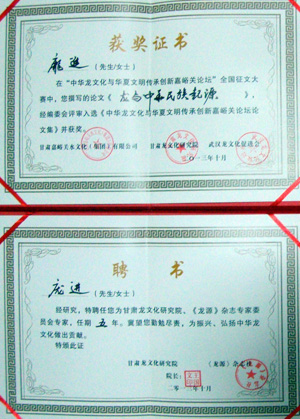 本次论坛还举行了“中华龙文化与华夏文明传承和创新嘉峪关论坛”全国征文大赛颁奖仪式暨《龙源》杂志专家委员会专家受聘仪式。庞进的论文《龙与中华民族起源》获奖;庞进与王东、闸东山、周宜兴、蒋明智、吉成名等受聘。论坛期间,与会专家学者还参观、考察了中华龙园、长城第一墩、嘉峪关关城、中华孔雀园、魏晋墓、讨赖河水文化景区、龙王阁、敦煌莫高窟、鸣沙山等。庞进为各景区题写“凤凰和美”、“腾龙起凤”、“龙王阁”、“龙凤和美”等书法作品多幅。(龙凤)