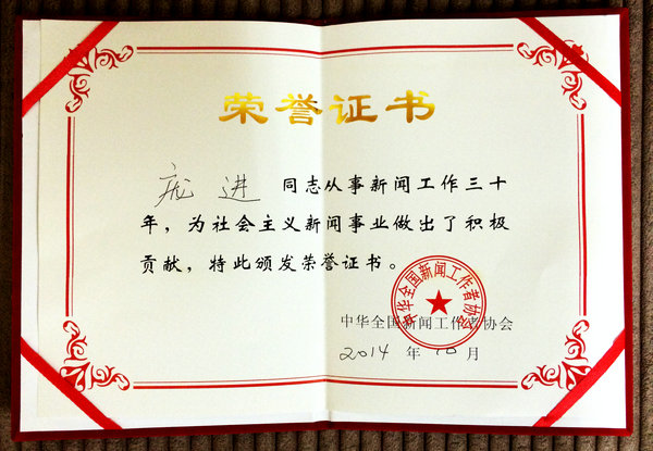 近日,著名学者、作家、西安日报社高级编辑庞进,获得了由中华全国新闻工作者协会颁发的“从事新闻工作三十年”荣誉证书和纪念章。