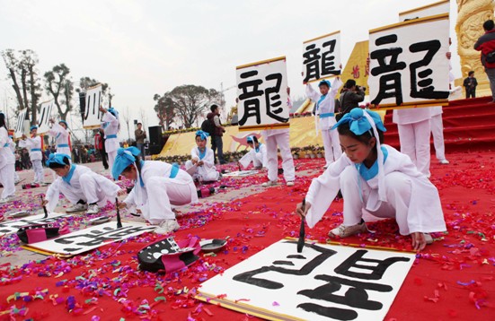 6日上午8点半,永川兴龙湖锣鼓喧天,“永川龙”民俗文化节正式开幕。一群身穿书童装的小朋友带着笔墨站到舞台中央,为大家书写“永川龙”,赢得阵阵掌声。