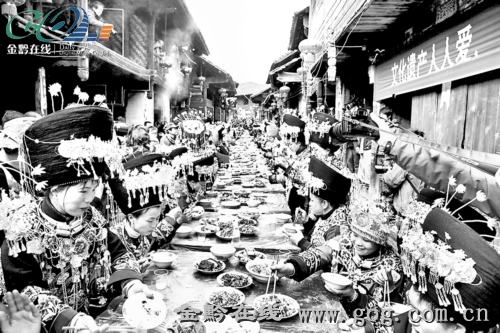 活动现场,来自该镇13个村以及该县的普觉镇,江口县的怒溪乡共40余条大小滚龙开展了精彩的舞龙表演,锣鼓喧天、礼炮齐鸣,彩龙翻飞,色彩斑斓的滚龙在古镇和新街及大小巷道翻滚舞动。此次活动吸引了来自省内外300余名摄影爱好者和周边乡镇2万余人前来观看,整个古镇一片沸腾,人山人海,万人空巷,场面盛况空前。图为滚龙长桌宴场景。