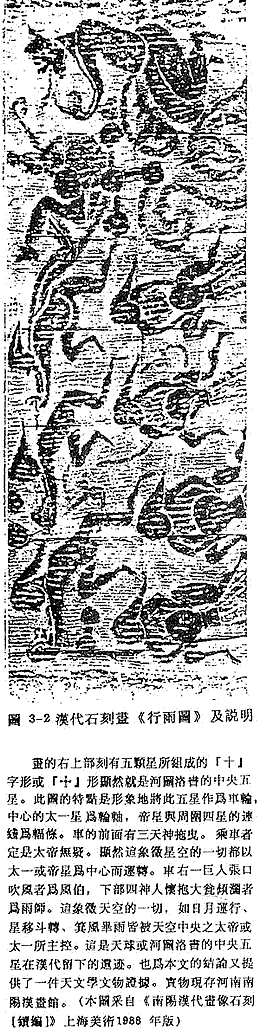 年代最早的是现存河南南阳汉画馆的一幅《行雨图》石刻画〖请参阅附图3-2,该图载《南阳汉代画像石刻(续编)》上海美术1988年版〗,画上刻有五星所组成的“十”形,这显然就是河图洛书的中央五星。此图的特点是形象地将此五星作为车轮,中心的太一星为轮轴,帝星与周围四星的连线为辐条。车前有三天神拖曳此车。乘车者坐(骨)在中心的轮轴上,乘车者定是太帝或太一无疑。其所表达的实际意义就是太帝坐(骨)在北极,这与M45墓主的坐骨在北极的意义相同。车右一巨人张口吹风者为风伯,下部四神人怀抱大瓮倾洒者为雨师。显然,这象徵天空的一切,如日月运行、星移斗转、箕风毕雨皆被天空中央之太帝或太一所主控。这是天球或河图洛书的中央五星在汉代留下的遗迹。这也为M45墓主是太帝的结论又提供了一件天文学文物证据。实物现存河南南阳汉画馆。