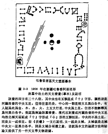 其次是1956年在新疆吐鲁番阿斯塔那唐墓中出土的天文壁画,该画为本文的附图3-3。该画四方有二十八宿,其中部也有五星组成的十字形,显然这是河图洛书的中央五星。值得注意的是,中心的一颗星较大且黑白各半。有的学者认为此为金、木、水、火、土五大行星,中央为土星(王兴业:《河图洛书探微》载《周易研究》季刊1993 年第三期)。但这不能解释其为何黑白各半。我认为无论该墓壁画、汉代石刻画或河图洛书的中央五星,均指上述北极天区成十字形的五颗恒星,中央的不是土星,而是太一或帝星。前《伏羲》一文已说明,太一就是太极,太极就是北极。中央太一星黑白各半,是太极分两仪之象;其余四星也象徵由两仪而生四象。这就为前文的论证方法和结论又提供了一件天文学的文物证据。