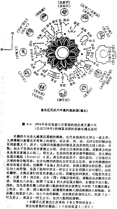 有关河图洛书中央五星与前文所论的太极生两仪,两仪生四象,四象生八卦而在天球上形成的分、至、启、闭八点的第三件考古文物证据就是公元1974年冬在张家口市发现的建於辽天庆六年(1116年)砖墓顶部的一幅彩绘星图(请参阅附图3-4, 该图采自夏鼐先生所著《考古学与科技史·从宣化辽墓的星图论二十八宿和黄道十二宫》)。 该星图的中央是九瓣莲花环绕的铜镜,周围有九个较大的圆点,其中一个较大,中绘有飞鸟状符号,有人称此为“金鸟”,作赤色,其余八颗,朱蓝各半。对此,学者有不同的解释(详参夏鼐文)。