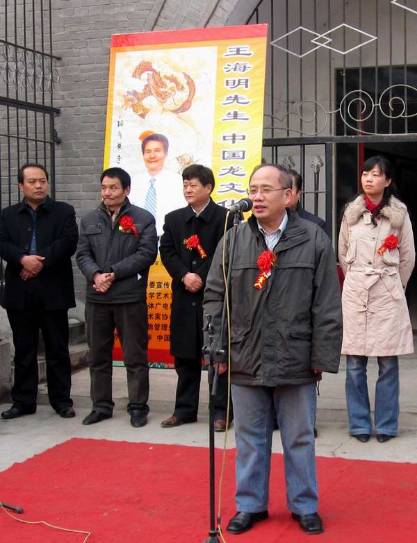 著名龙文化研究专家、龙凤国际联合会主席、中华龙凤文化研究中心主任庞进出席了画展开幕式并讲话。他以“人文内涵丰富,大气鲜亮、特色突出”评价王海明的龙画,赞赏其以美术的方式对龙文化事业所做出的精彩贡献。他说:龙文化既是民俗文化、民族文化,也是国家文化、世界文化。龙文化需要全方位、多方式地宣传、推广和弘扬,书法绘画就是广大群众喜闻乐见的形式之一。开幕式后,庞进欣然为王海明龙画展题词《神龙福生》,还在当地官员的陪同下,参观、考察了户县钟楼、公输堂等景点。(龙凤)