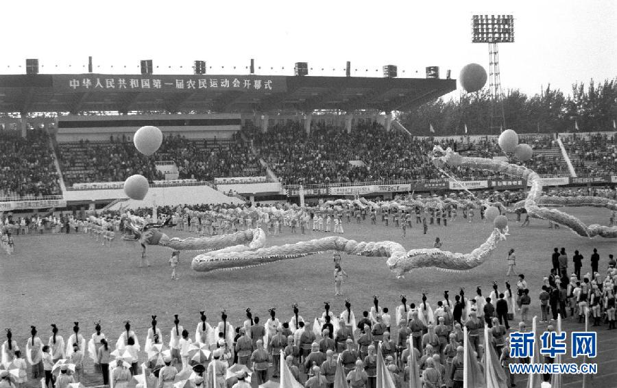 为1988年10月9日,在第一届全国农民运动会开幕式上,演员们表演《金龙腾飞》。舞龙,又称“龙灯舞”、“耍龙灯”,是我国民间独具特色的传统活动,距今已有两千多年的历史。如今,舞龙已成为集欢庆、竞技、健身于一体的群众性体育运动。