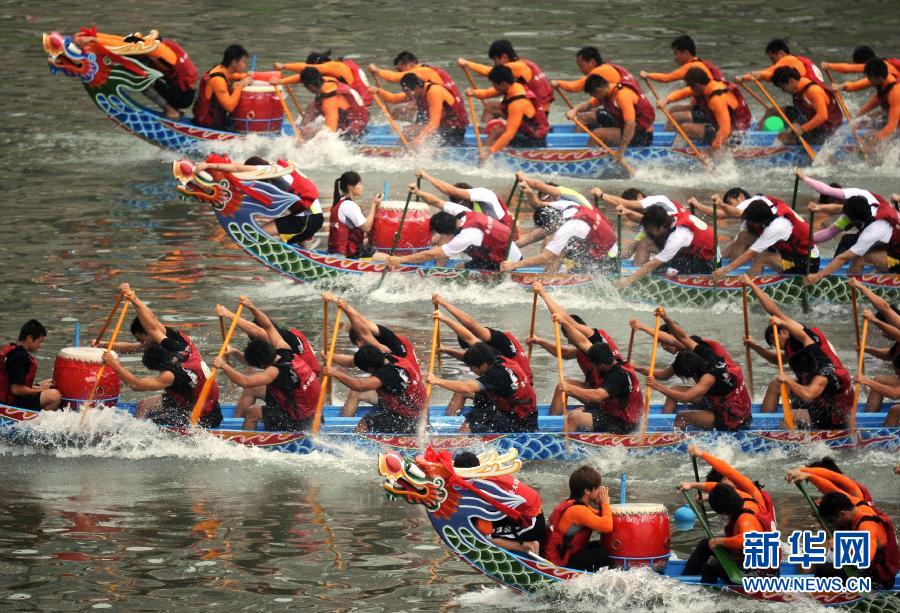 为2010年6月13日,在台北市大佳河滨公园举行的龙舟锦标赛上,队员们奋力争先。赛龙舟是一项中国民间传统水上体育竞技项目,由多人集体划桨竞赛。关于龙舟的起源,流传最广的是源于纪念楚国爱国诗人屈原。新华社发