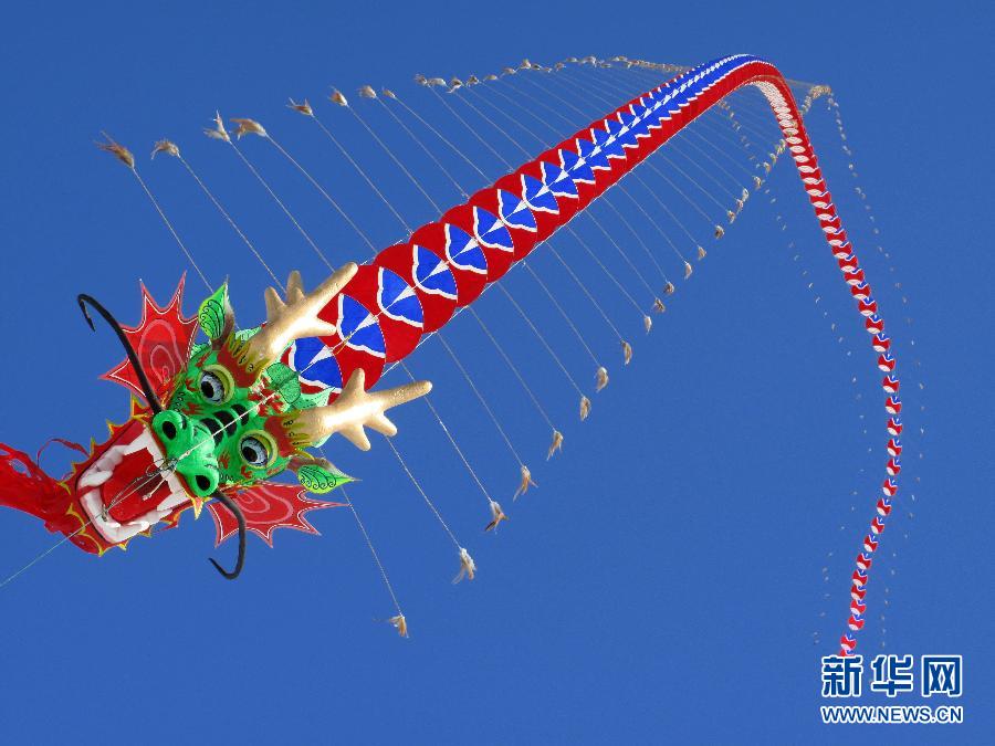 为2010年3月17日,巨型龙风筝在吉林举行的第十届风筝会比赛中翱翔天空。风筝起源于中国,是一项具有悠久历史的民间传统体育活动。新华社发