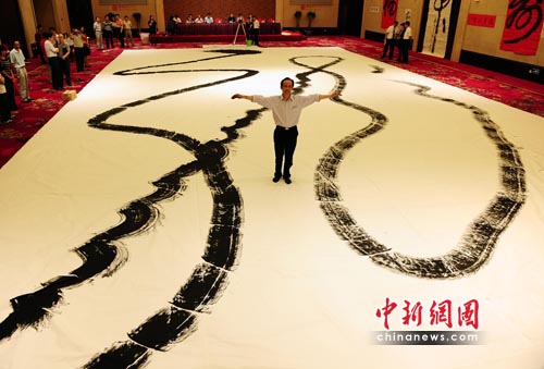 中新网5月27日电(蒲波) 26日下午,世界最大榜书在北京诞生,这是由著名书法家徐双喜在272.25平方米的宣纸上写下的草书“龙”字。
